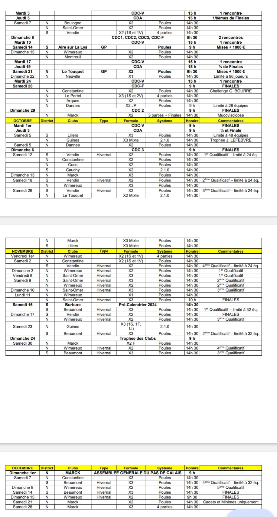 CALENDRIER CD 62 2024 Septembre à Décembre 2024